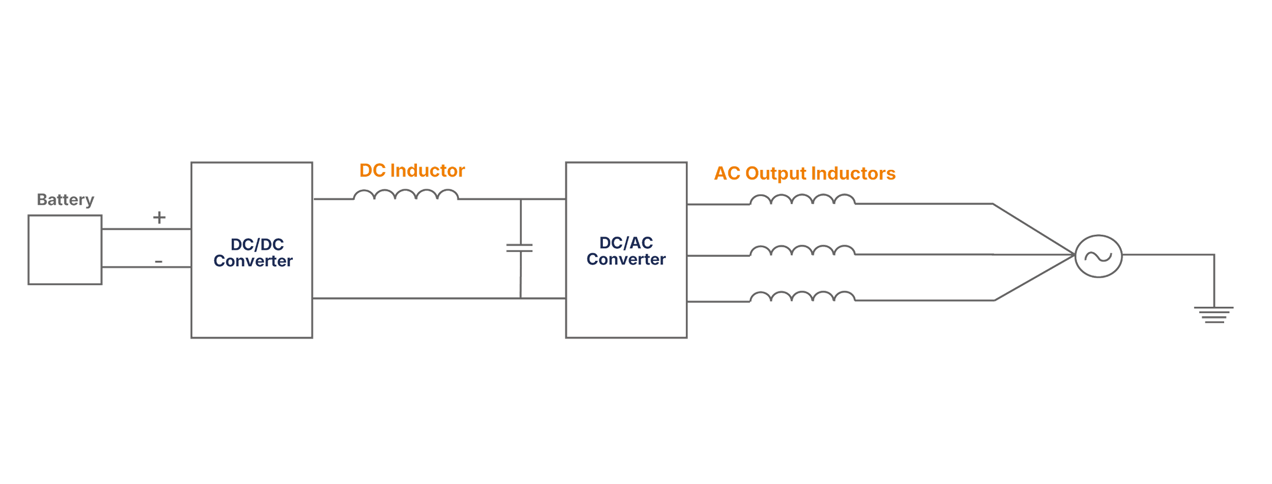 Above is the DC Link Choke connected to the DC bus terminals of the 3-Phase Motor Drive. Switching frequencies less than 5kHz allow the use of a silicon steel core.